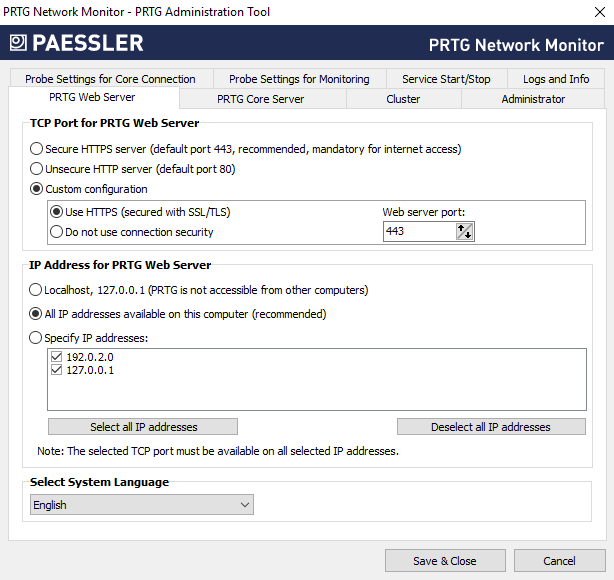 i_round_redThe selected Transmission Control Protocol (TCP) port for the PRTG web server must be available on all selected IP addresses.