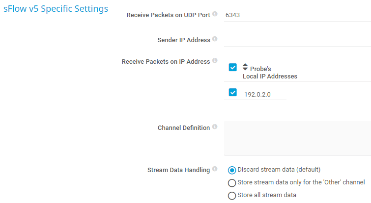 This sensor requires that the sFlow v5 export is enabled on the target system. The target system must send the flow data stream to the IP address of the probe system.