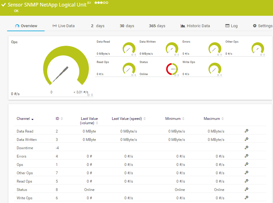 The SNMP NetApp Logical Unit sensor monitors the input/output operations per second (IOPS) on a logical unit of a NetApp storage system via the Simple Network Management Protocol (SNMP).